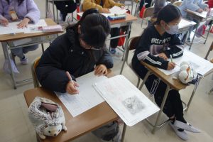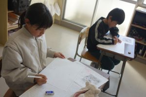 3年生3年生の国語では、物語を書いています。地図をもとに宝物を探す冒険のお話です。地図を見て思い浮かんだ登場人物やエピソードなどを地図にメモ書きして物語を書き始めました。みなさん自分の思い描いた物語の世界に入り込んでいたようで、集中して書いていましたね。完成がとても楽しみです。