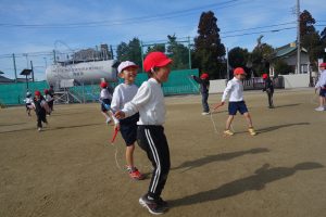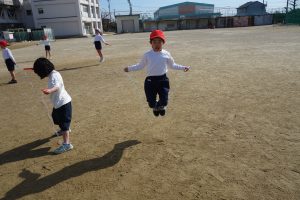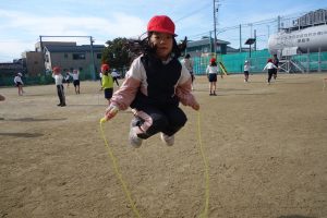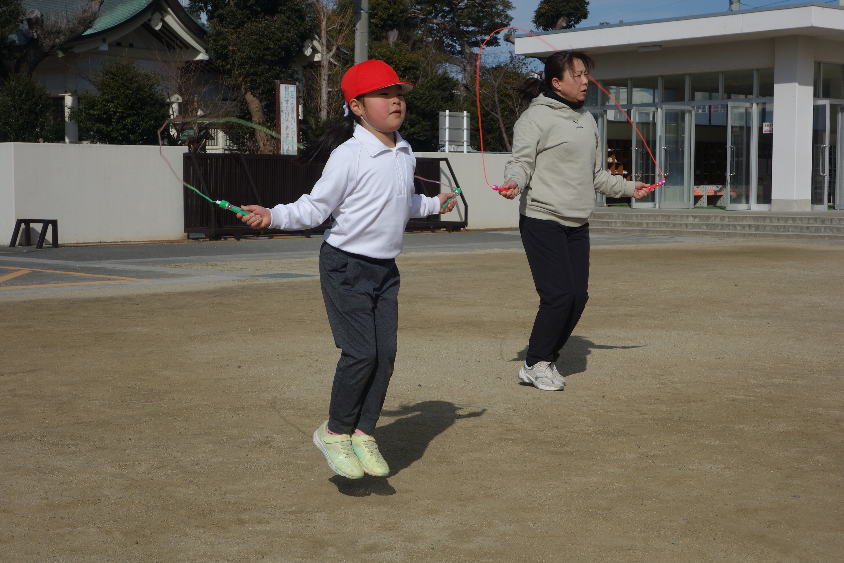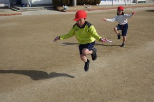 なわとび 1年生 2026.02.12 1年生は体育でなわとびの練習をしました。前跳びや後ろ跳び、片足跳びの練習をしました。模範演技をした子の手が大きく動いていないことを知ってからは、縄を回す腕の動きに気を付けて練習していました。
