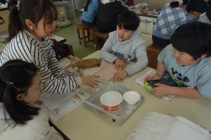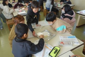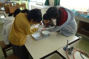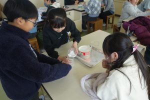 水のすがたと温度 4年生 2026.02.12 4年生の理科は、温度によって変わる水の姿について学んでいます。この日は、水が冷えて氷になるときに水の温度や様子がどのように変わるのかを実験で調べました。班の仲間と協力して準備をし、凍るときの温度を記録しました。