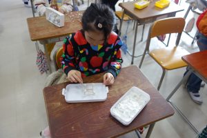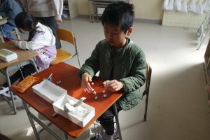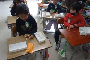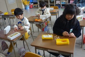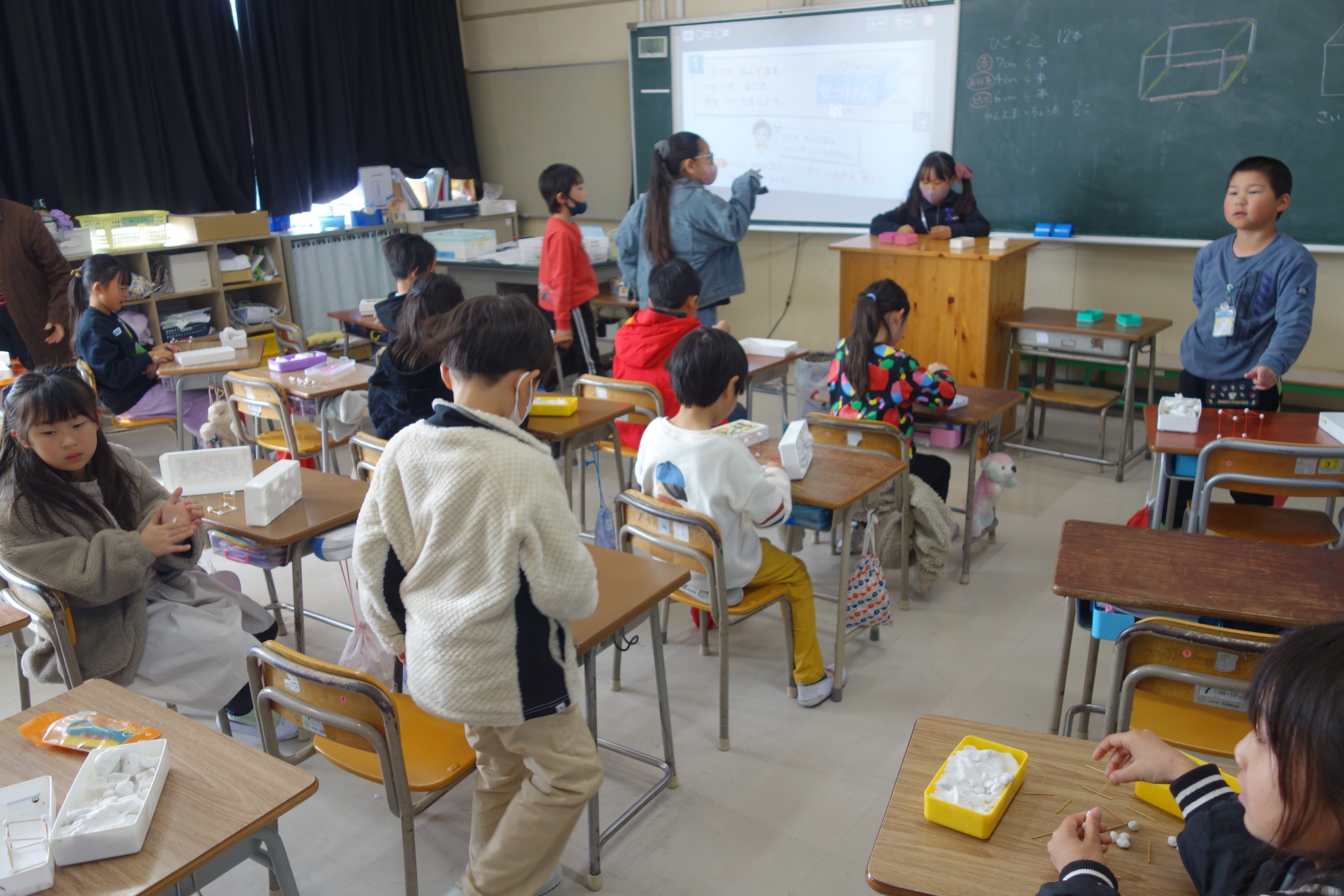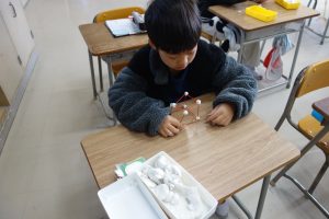 2年生の算数は、立体図形の学習をしています。この日は、直方体や立方体を、ひごと粘土玉でつくってみました。辺の数や角の数の説明を聞いてから、自分で必要な本数のひごを用意しました。苦労して立体を完成させると「先生、できました」と明るく元気な声で報告していました。