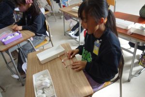 2年生2年生の算数は、立体図形の学習をしています。この日は、直方体や立方体を、ひごと粘土玉でつくってみました。辺の数や角の数の説明を聞いてから、自分で必要な本数のひごを用意しました。苦労して立体を完成させると「先生、できました」と明るく元気な声で報告していました。