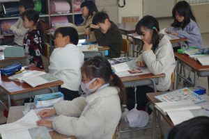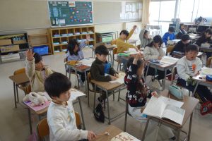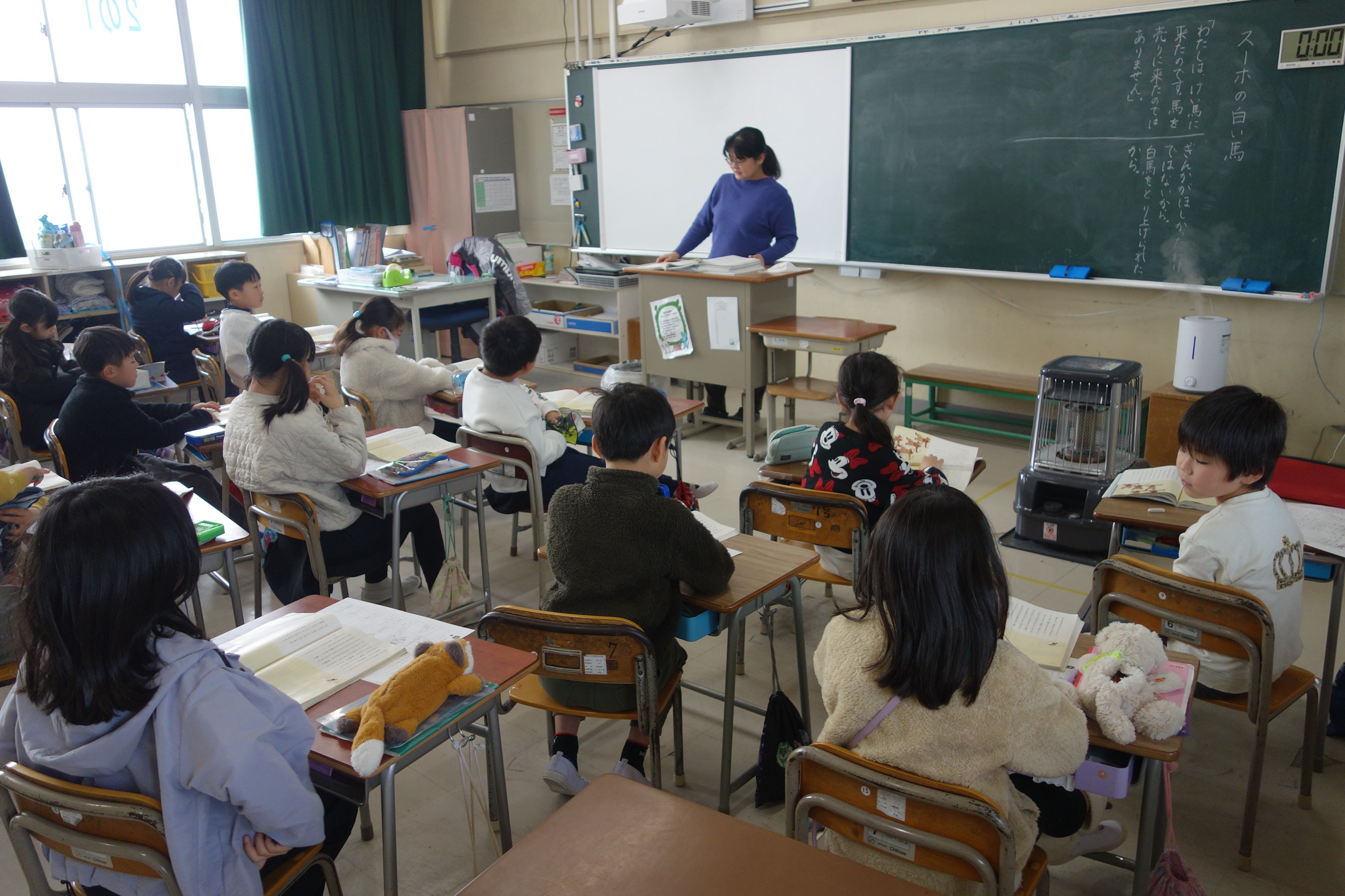 スーホの白い馬 2年生 2026.02.24 2年生の国語は、物語文の読み取りをしています。読んで感じたことや分かったことを伝え合いながら学習を進めています。この日は、馬が戻ってきた場面で、スーホが『はね起きた』という言葉に注目して、そのときのスーホの心情を読み取りました。