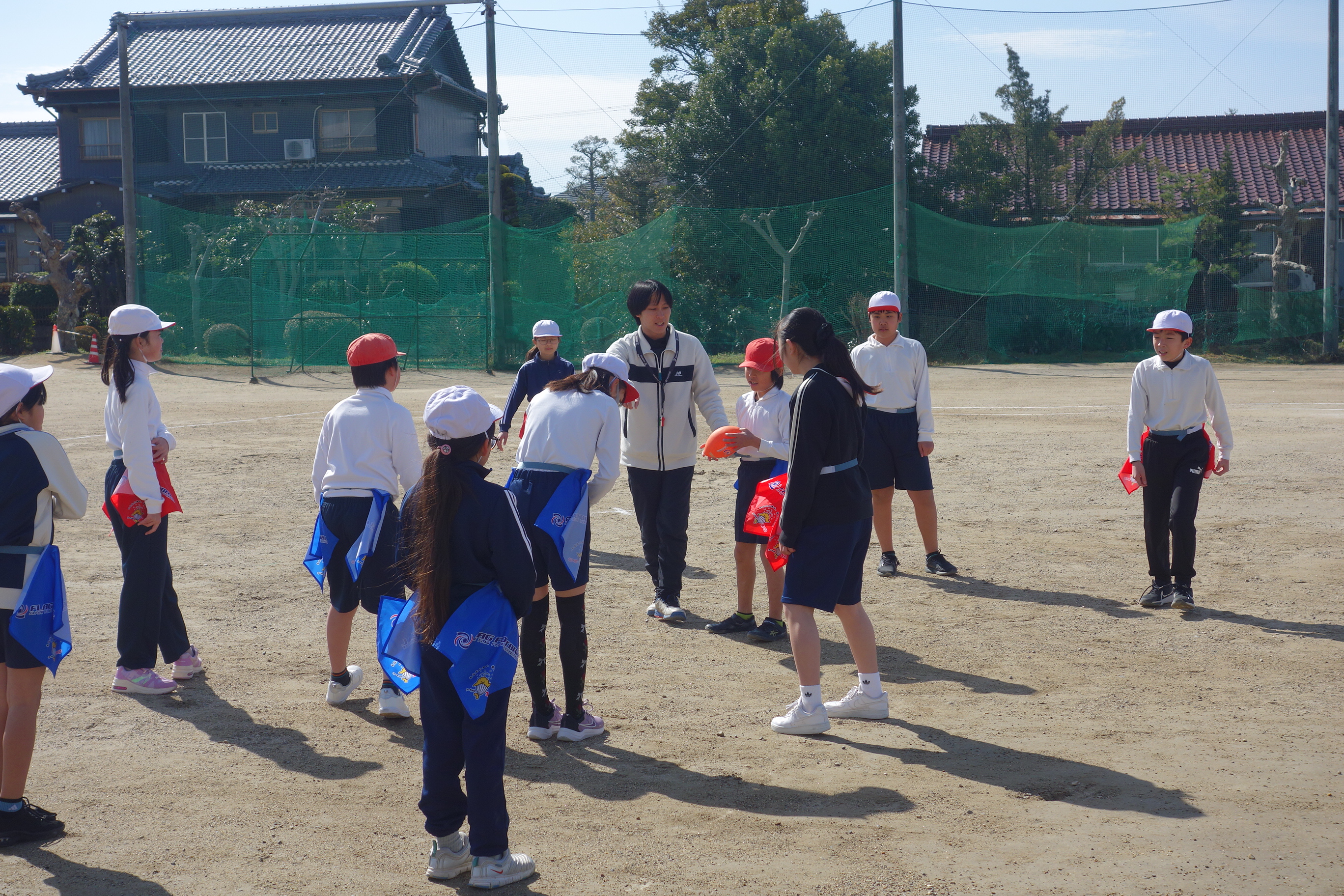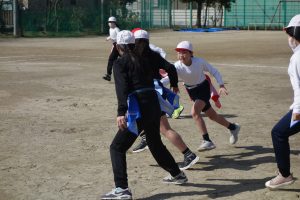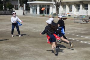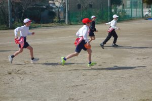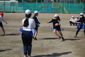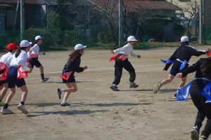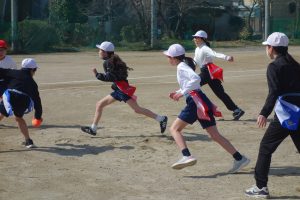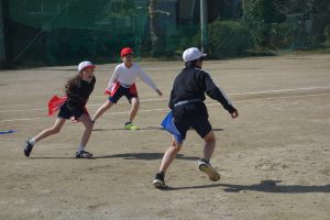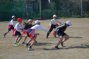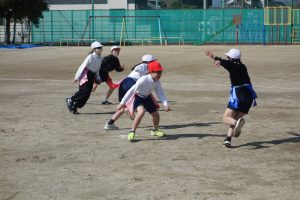 タグラグビー 5年生 2026.03.09 5年生の体育はタグラグビーでした。どのタイミングで味方にパスをするとよいのか、パスを受けて相手を抜き去るにはどうしたらよいのかなどをチームで考えながらゲームをしました。躍動感あふれた動きが随所に見られました。