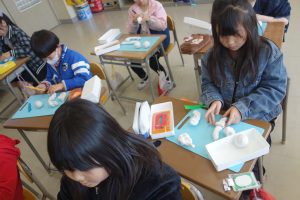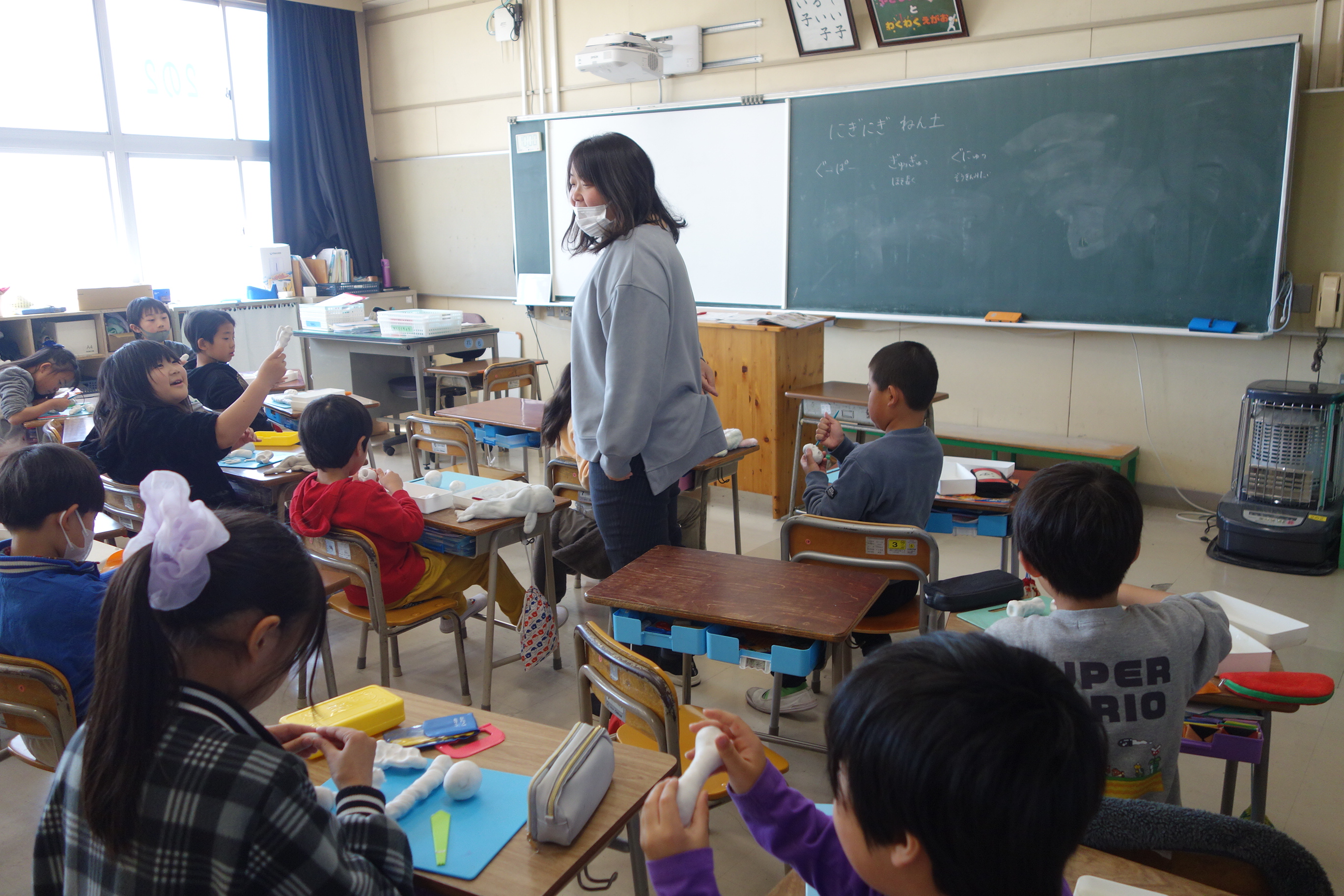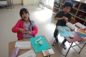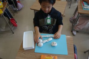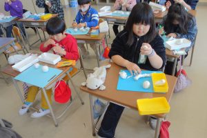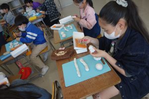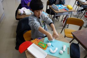 にぎにぎねんど 2年生 2026.03.12 2年生の図画工作は、粘土で立体物をつくりました。粘土をにぎったり、丸めたりしたときの形をじっくり見て、何に見えるのかを想像してつくりました。にぎった指の形が残っていたら、それをいかして食べ物や生き物をつくりました。