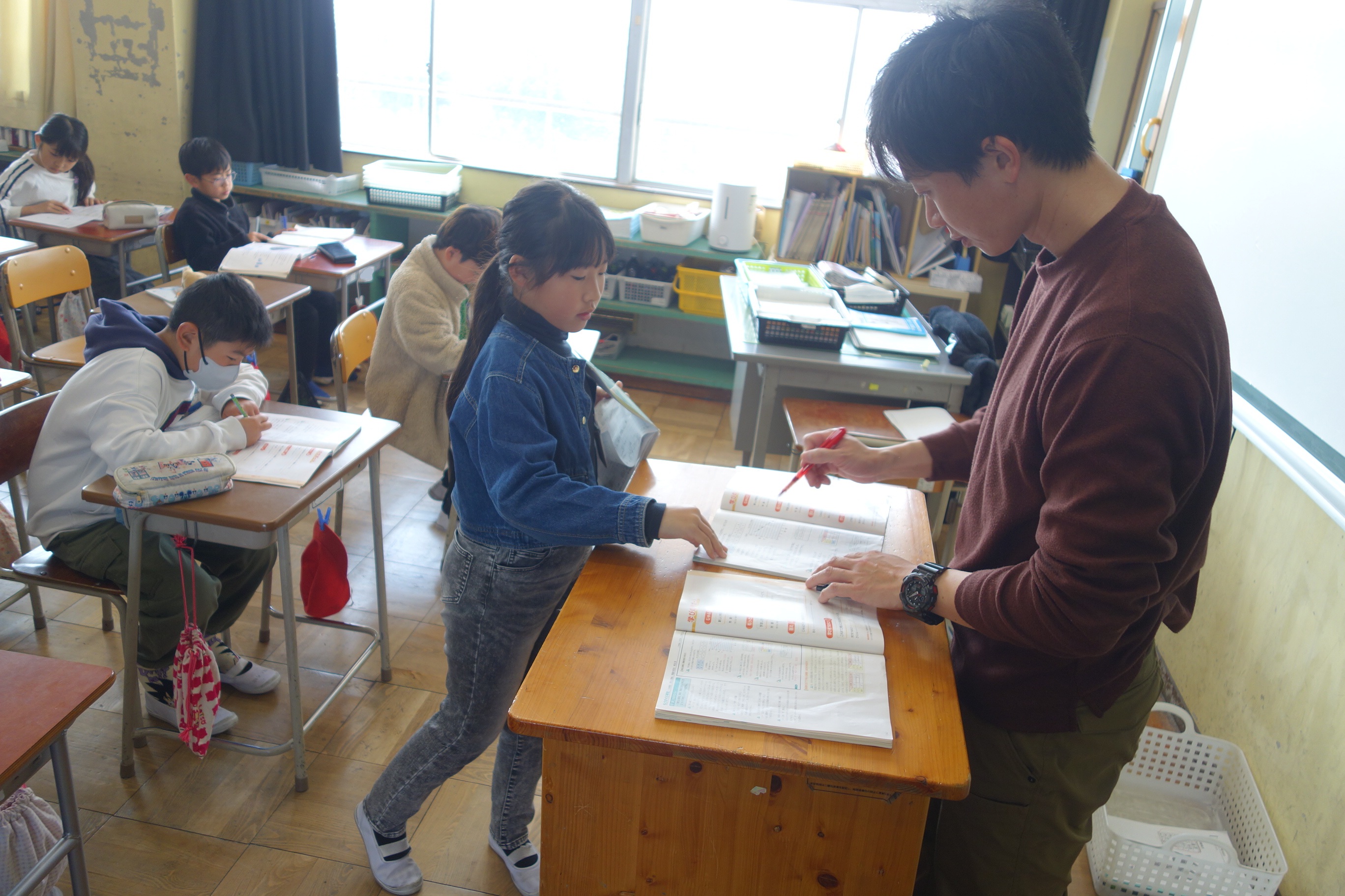 もうすぐ5年生 4年生 2026.03.18 4年生の算数は、4年生の学習のまとめとして練習問題に取り組みました。指定された問題が全部解けたら担任の先生に見せに行きます。全問正解して合格した子は、問題を解いている子にアドバイスをしていましたね。
