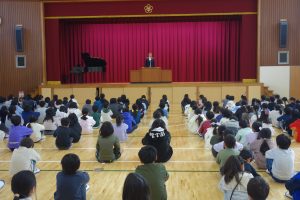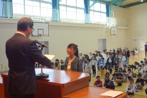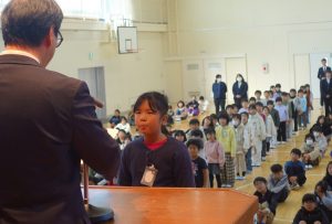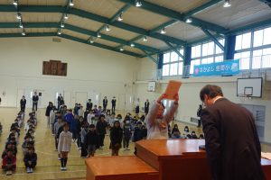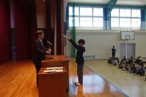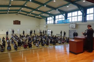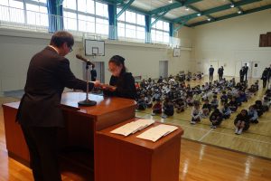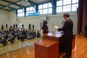 この日は今年度最後の登校日。朝、体育館に全校で集まって修了式を行いました。式の前に明るい選挙啓発ポスターと家庭の日のポスターの表彰がありました。修了式では、各学年の代表が修了証を受け取りました。とても立派な振舞いでした。その後、校長先生の話、生徒指導の先生の話を聞き、校歌を歌いました。みなさん、春休みは健康と安全に気を付けて過ごし、次の学年の準備をしてくださいね。