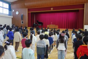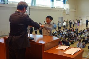 学校行事この日は今年度最後の登校日。朝、体育館に全校で集まって修了式を行いました。式の前に明るい選挙啓発ポスターと家庭の日のポスターの表彰がありました。修了式では、各学年の代表が修了証を受け取りました。とても立派な振舞いでした。その後、校長先生の話、生徒指導の先生の話を聞き、校歌を歌いました。みなさん、春休みは健康と安全に気を付けて過ごし、次の学年の準備をしてくださいね。