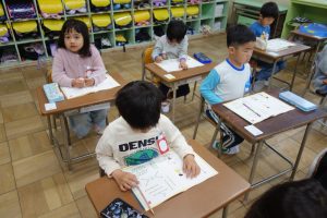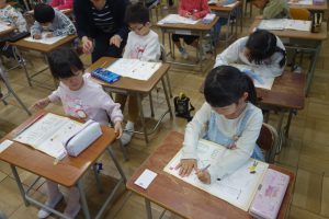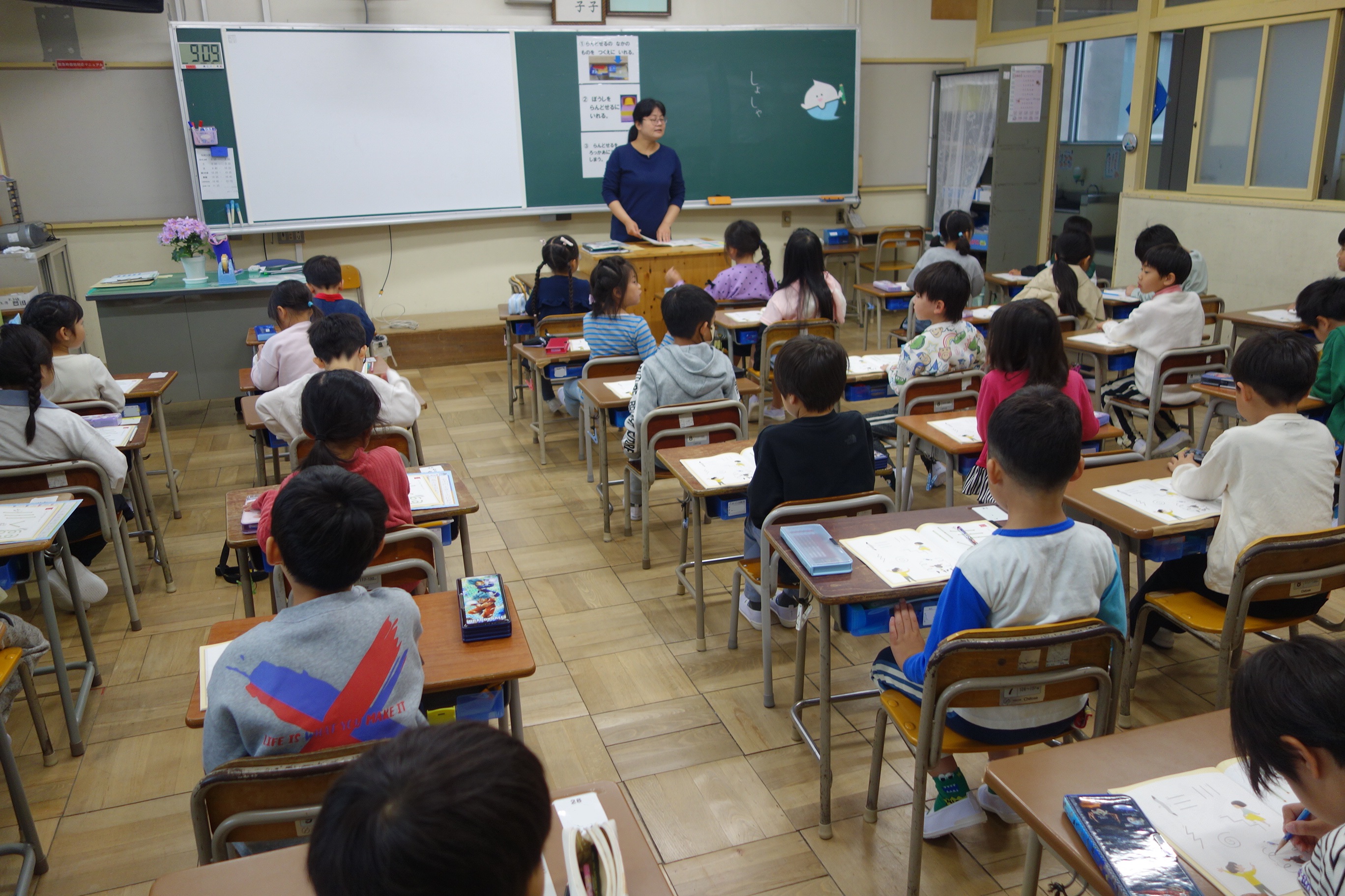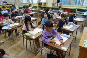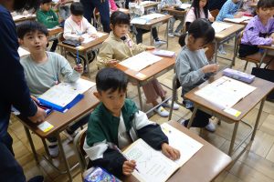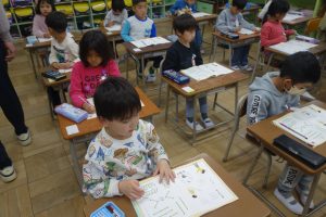 しょしゃ 1年生 2026.04.10 1年生は国語で書写の勉強をしました。まず、字を書くときの姿勢や鉛筆の持ち方などを学びました。それから書写ノートの直線や曲線を、丁寧になぞりました。みなさん、張り切って書いていましたね。