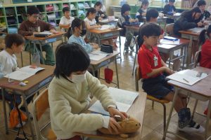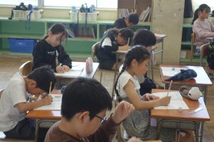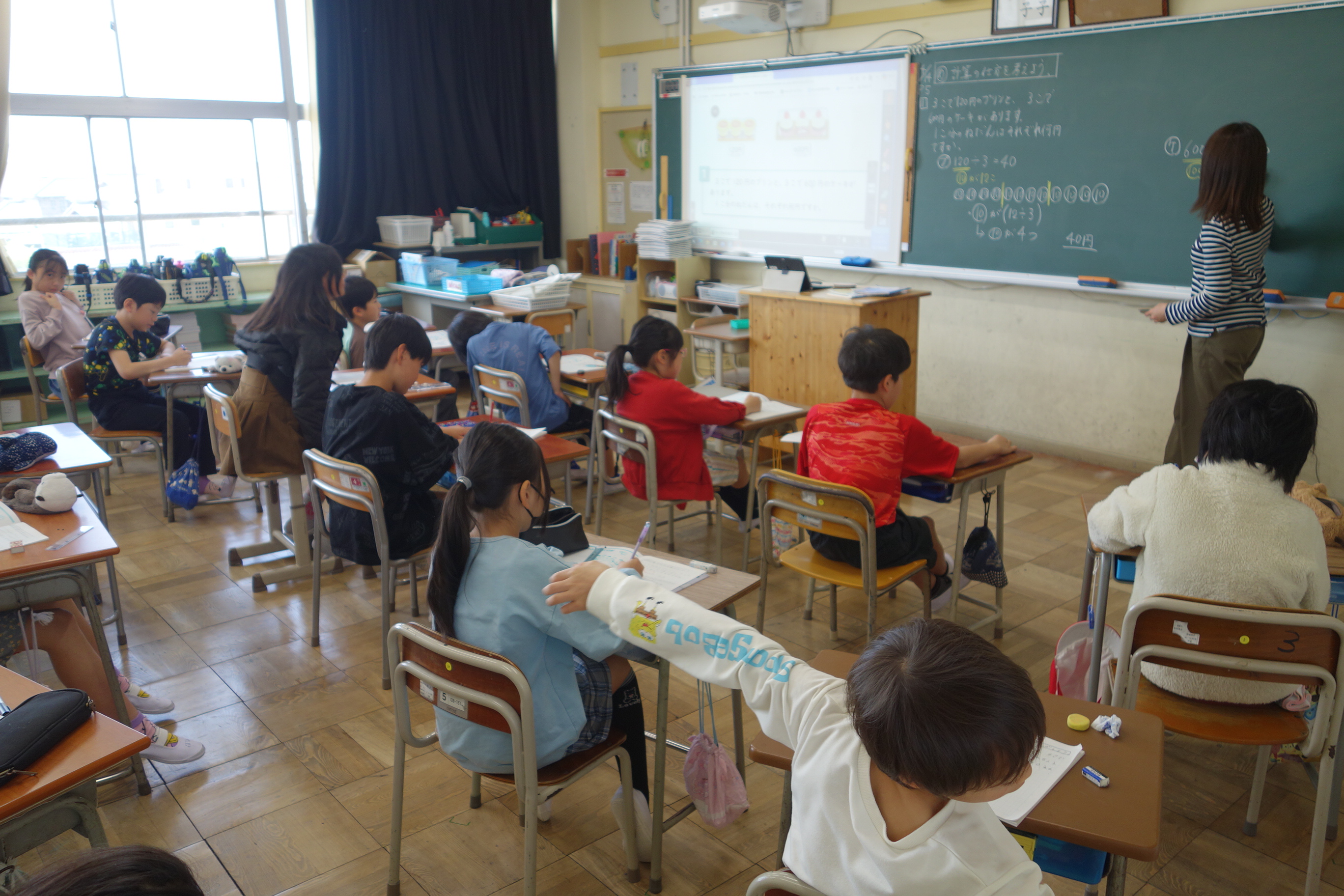 計算の仕方を考えよう 4年生 2026.04.15 4年生の算数は、文章題を読んで、その計算の方法を考えました。文章の内容を表した図を参考に、式を立てました。先生の出したヒントを集中して聞きながら、みなさん真剣に問題に取り組んでいました。