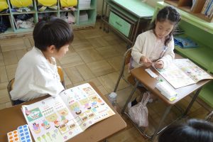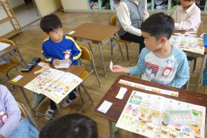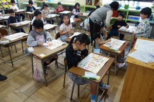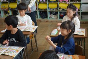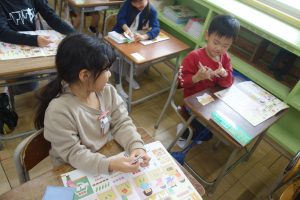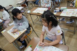 1年生1年生の算数は、数と数字について学んでいます。この日は1から5までの数について学びました。そして、数に合わせて数図ブロックを並べる活動をしました。その後、ペアを組んで、相手に言われた数のブロックを並べる活動をしました。問題の出し合いをにこやかに行っているペアが多かったですね。