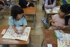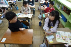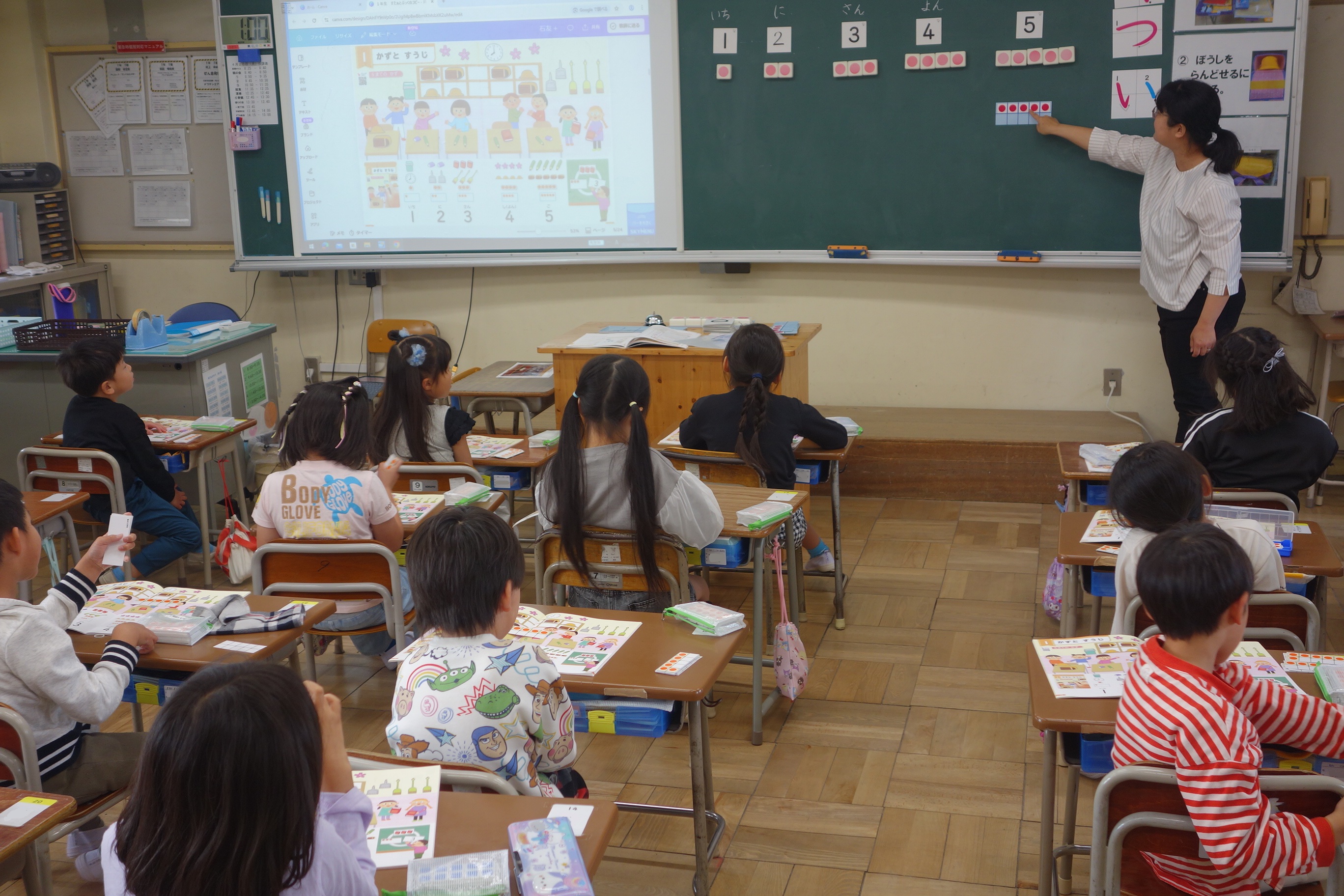 1年生の算数は、数と数字について学んでいます。この日は1から5までの数について学びました。そして、数に合わせて数図ブロックを並べる活動をしました。その後、ペアを組んで、相手に言われた数のブロックを並べる活動をしました。問題の出し合いをにこやかに行っているペアが多かったですね。