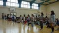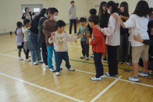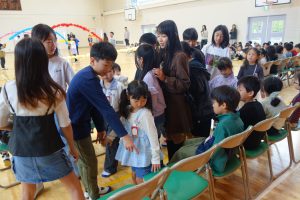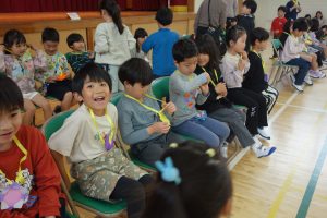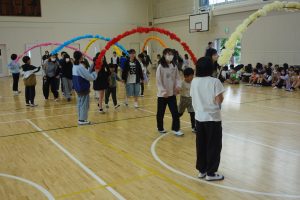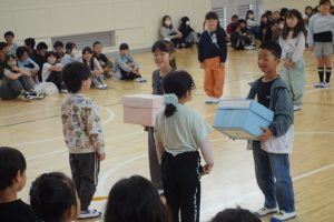 体育館で1年生をむかえる会を行いました。1年生は6年生と一緒に入場しました。2年生から順番に1年生を歓迎する出し物を披露しました。種やメダルのプレゼントがあったり、クイズや校歌の伝授があったりと盛りだくさんの内容でした。最後は6年生といっしょにじゃんけん列車を楽しみました。1年生にとって、楽しい交流の時間になったことと思います。