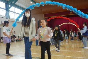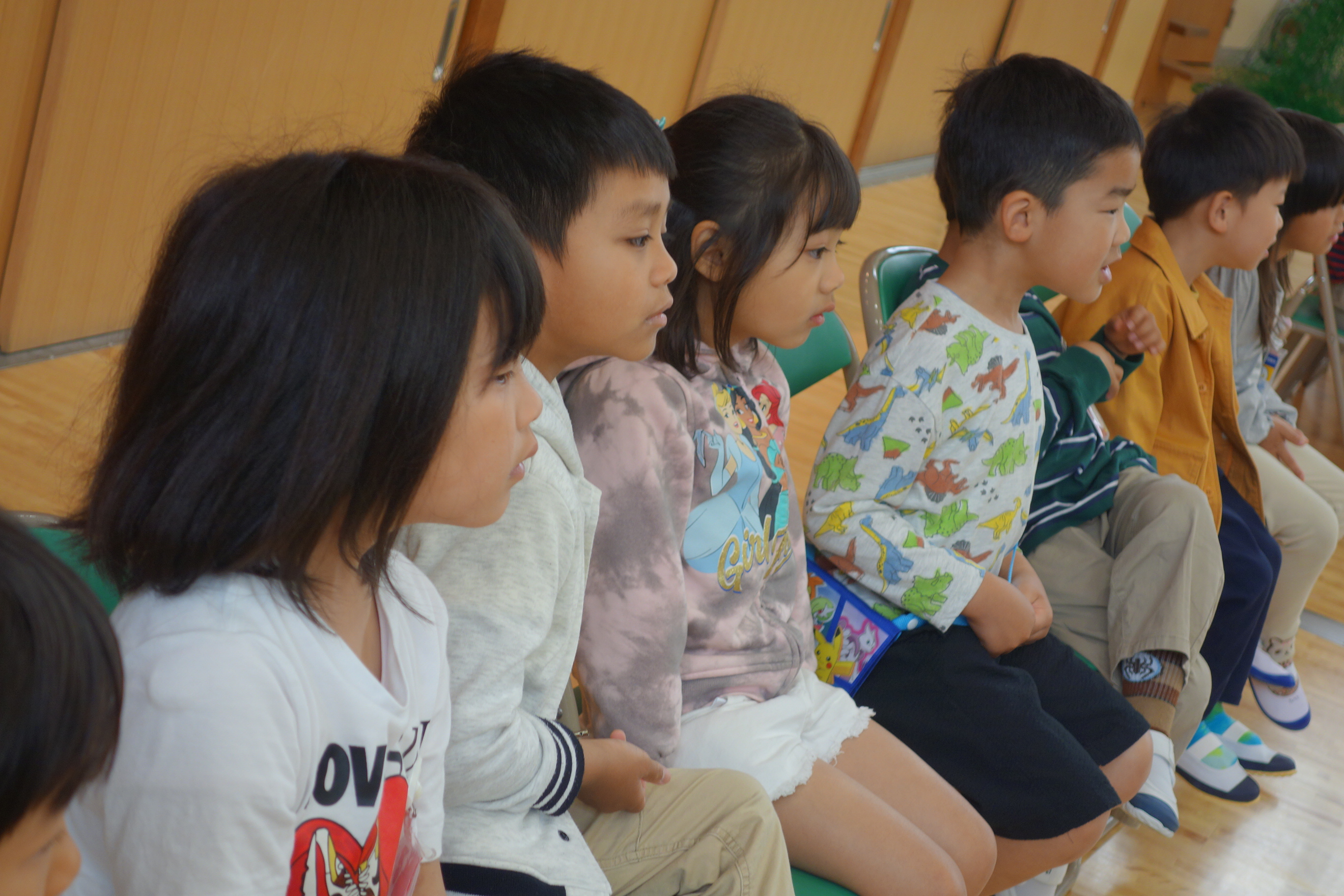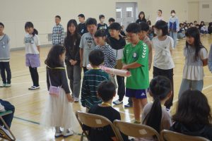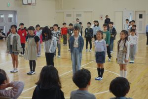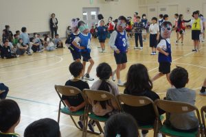 学校行事体育館で1年生をむかえる会を行いました。1年生は6年生と一緒に入場しました。2年生から順番に1年生を歓迎する出し物を披露しました。種やメダルのプレゼントがあったり、クイズや校歌の伝授があったりと盛りだくさんの内容でした。最後は6年生といっしょにじゃんけん列車を楽しみました。1年生にとって、楽しい交流の時間になったことと思います。