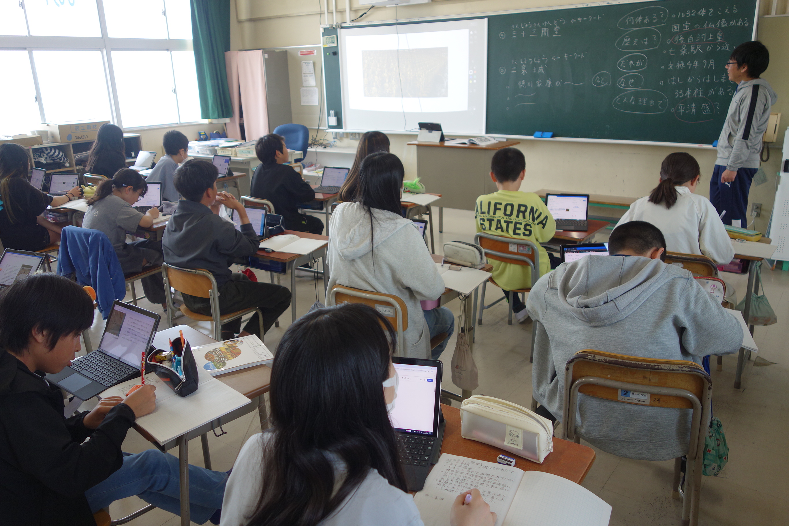6年生の学級活動は、修学旅行にむけての調べ学習でした。実際に見学する二条城や三十三間堂について調べたことを皆で共有しました。建物の大きさやできた年号などといっしょに、かかわりの深い歴史上の人物も分かりました。こういった知識をもって見学すると更に充実した修学旅行になりますね。