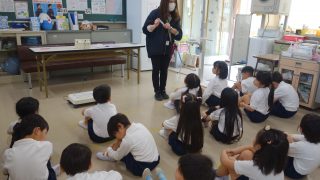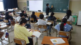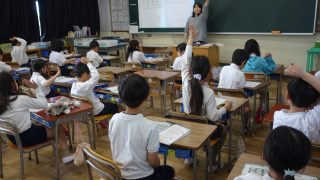 5年生の理科は、4年生の復習をしました。黒板に問題を出し、班の仲間と早押しクイズ形式で答えます。頭の上に手を置いて問題を聞いているときの緊張感はすごかったですね。みなさん、とても楽し気に復習問題に取り組めました。